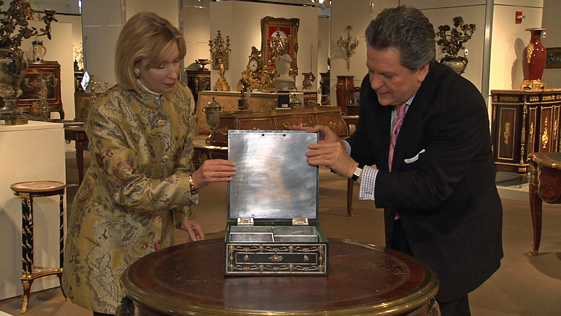Bill Stubbs (pictured, right) examines rare objects with Sotheby’s Senior Vice President of 19th Century Furniture,Sculpture and Works of Art Elaine Whitmire. Photo by Dan Woolsey